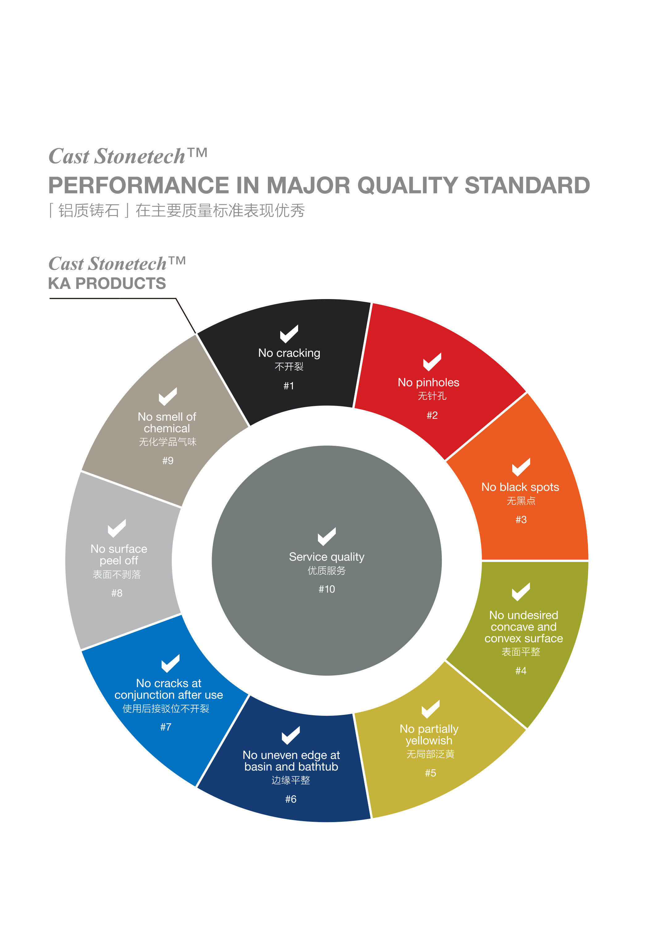 Cast Stonetech™已获得ISO9001: 2015国际质量认证GMC(Global Manufacturer Certificate环球生产厂证书)、符合GB中国国家标准,JC中国行业标准,符合欧洲CE、美国和加拿大cUPC等国际贸易及生产质量标准。