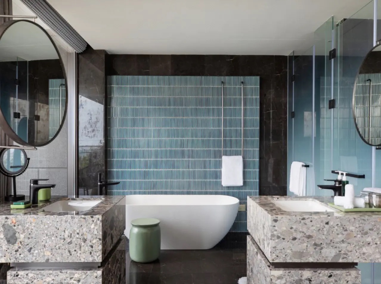 - 酒店共108间客房,以传统与时尚相结合的苏式风格为主,所有客房都配备了KA超薄边浴缸,高级石材质感成就客房卫浴空间简约素雅的艺术设计,让客人尽享度假的怡然自得。