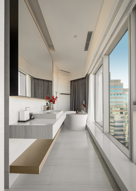 - 北京盈科中心·景苑公寓采用现代简约风格的室内装修,区别于以往豪宅中式或者新中式的厚重感,更时尚年轻。
